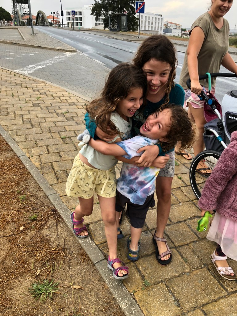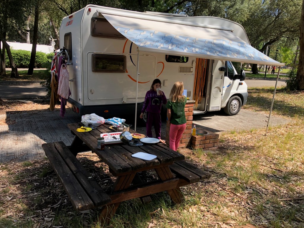 השכנים שלנו הם משפחה גרמנית שמטיילים כבר שנה בקרוואן. האבא בריון בגובה 2.13 יוצא יחידת קומנדו, שעובד כיום בחינוך ילדים עם צרכים מיוחדים. בן אדם רך ונחמד במיוחד, שהצליח לעמוד בגבורה למטר שאלות של מוריה ושני במשך שעתיים בלי להתעייף או למצמצץ, סיפר להם את הסיפורים על כל הקעקועים שלו, ואפילו הכין להן ולדוד צמידים צבאיים תוך כדי.