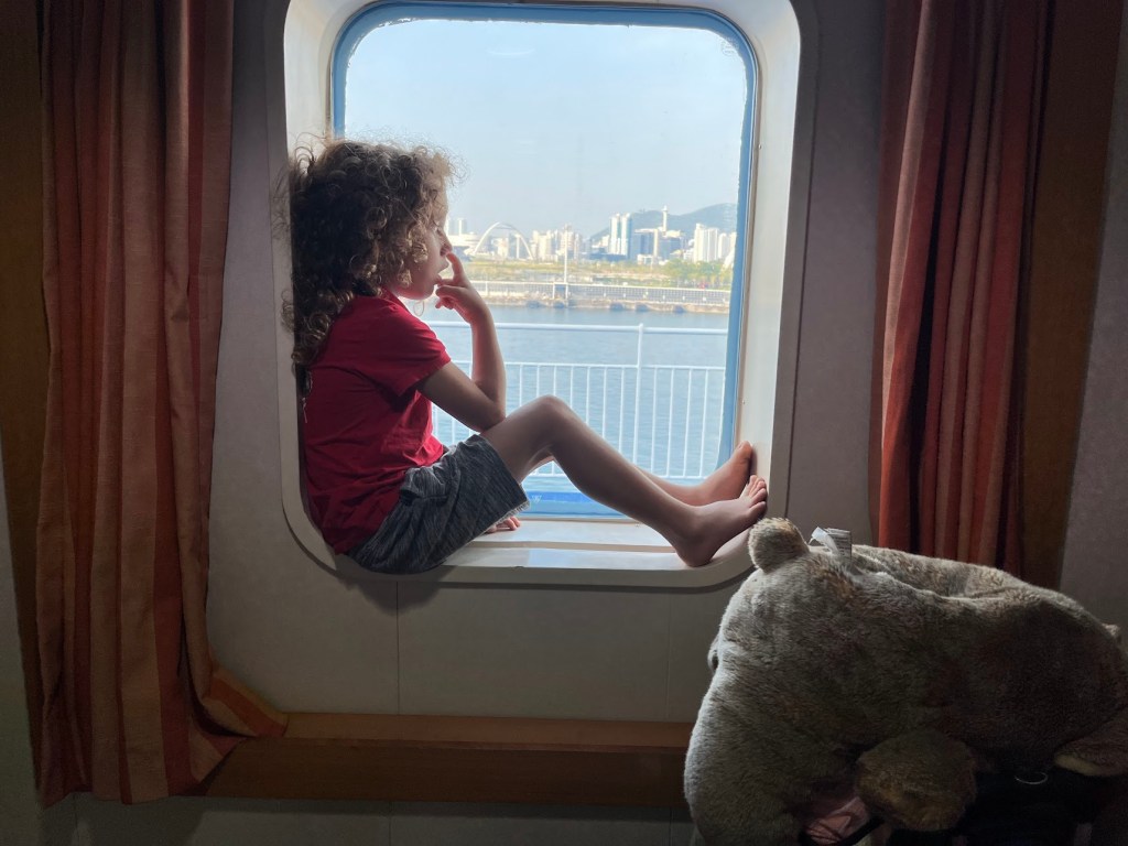 וכך אחרי יום ארוך מצאנו את עצמנו לקראת שקיעה, עייפים אך מרוצים, על סיפון מעבורת לדרום דרום קוריאה.